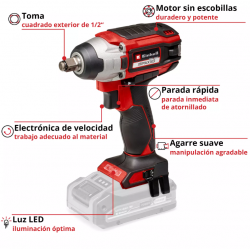 La ventaja es obvia: los cables molestos, el riesgo de tropezar y las deformaciones no deseadas debidas al espacio limitado para el movimiento ahora son cosa del pasado gracias a la nueva, potente y duradera generación de herramientas inalámbricas de Einhell. Esto permite un trabajo rápido y seguro en todas las ruedas. El alto par del potente atornillador de impacto con batería aporta la potencia suficiente para aflojar las tuercas atascadas, encajadas u oxidadas en un santiamén. El par máximo es de 230 Nm, mientras que el par de aflojado es de 450 Nm. En cualquier potencia, el IMPAXXO 18/230 es un peso ligero para su calibre y así cómodo en el manejo. El atornillador de impacto tiene una robusta recepción de cuadrado exterior de 1/2", y en el envío se incluye un adaptador de brocas para atornillar. La luz LED integrada para iluminar el área de trabajo también permite un cambio rápido de neumático si se da el caso: al anochecer, en la oscuridad o en garajes sin la iluminación adecuada. El envío se realiza sin batería ni cargador, estos son adquiribles por separado.